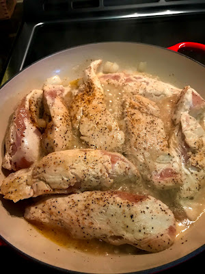 Started with evoo, and some butter and sautéed onion and garlic...then added chicken breast cut into strips, seared with salt and pepper.